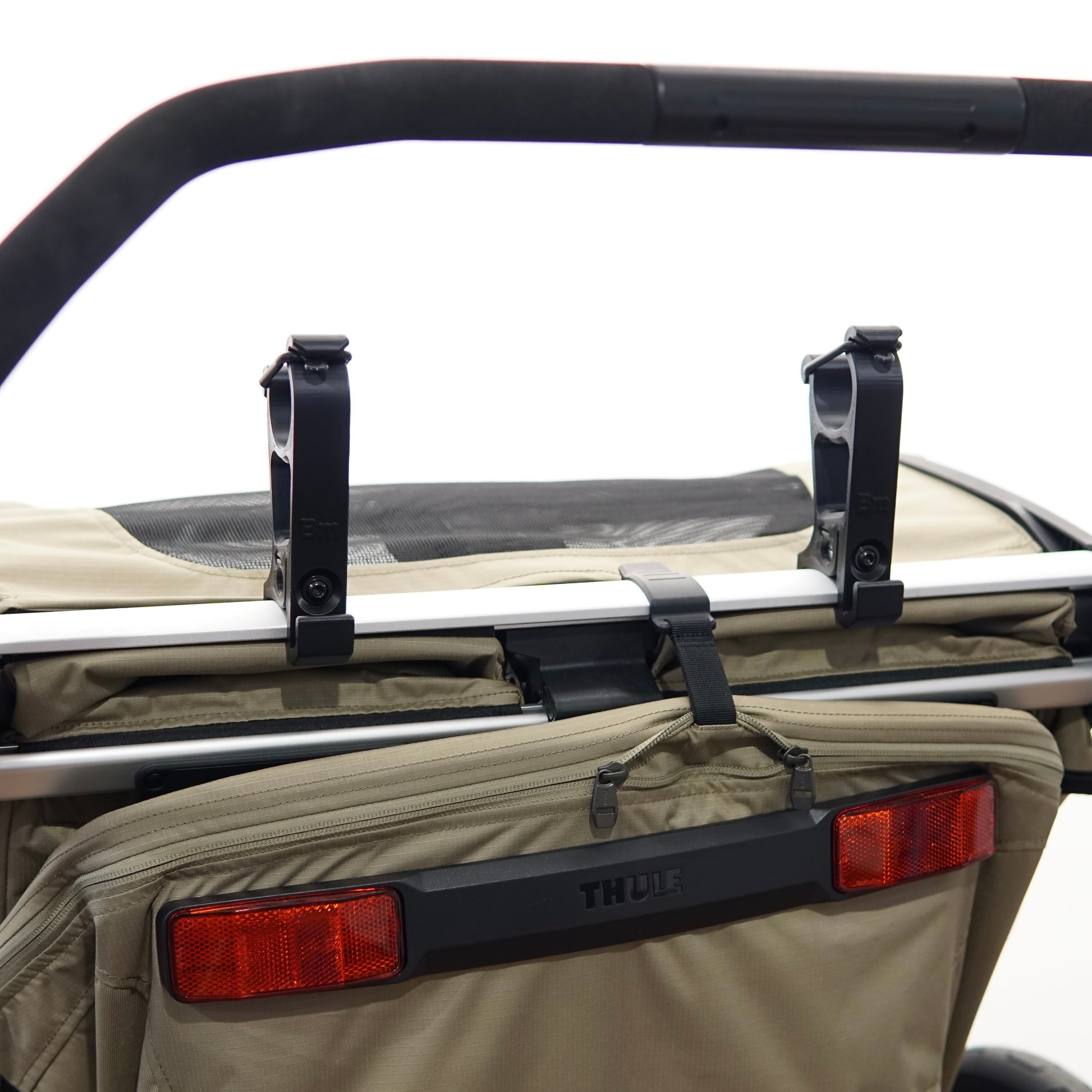 Mit unseren speziell auf die Kinderwagen der Firma Thule angepassten Halterungen könnt Ihr Kinderlaufräder und Kinderfahrräder sicher über lange Strecken transportieren. Einfach auf die beiden Haken einklicken und das Bike im Bereich der Griffe einhängen. Die zusätzliche Sicherung durch ein Gummiband hält das Fahrrad auch bei Radtouren über Feldwege sicher am Platz. Ihre spezielle Form ermöglichen eine einfache Montage und durch die Aussparungen können die Halter auch mit Regenverdeck genutzt werden. Der großzügige Durchmesser passt für alle möglichen Lenkerformen und Durchmesser. Die Laufradhalter werden mit einer M6 Schraube am Verrutschen gesichert. Der eingebrachte Pfeil zeigt Euch die Montagerichtung an. An dem nach hinten gerichteten Haken könnt ihr zusätzliches Gepäck einhängen. Wir verwenden ausschliesslich langlebige und UV beständige Kunststoffe. 3D-gedruckt mit Ökostrom.