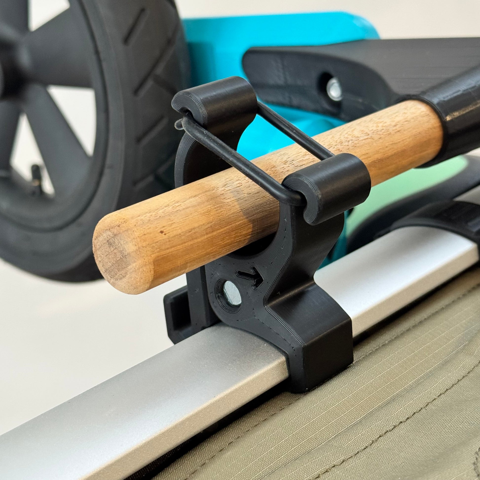 Ihr seid mit den Kids auf Achse und wollt das Laufrad mitnehmen? Ihr macht eine Fahrradtour mit Euren Kleinen und plötzlich machen Sie schlapp? Mit unseren speziell auf die Kinderwagen der Firma Thule angepassten Halterungen könnt Ihr Kinderlaufräder und Kinderfahrräder sicher über lange Strecken transportieren. Einfach auf die beiden Haken einklicken und das Bike im Bereich der Griffe einhängen. Die zusätzliche Sicherung durch ein Gummiband hält das Fahrrad auch bei Radtouren über Feldwege sicher am Platz. Ihre spezielle Form ermöglichen eine einfache Montage und durch die Aussparungen können die Halter auch mit Regenverdeck genutzt werden. Der großzügige Durchmesser passt für alle möglichen Lenkerformen und Durchmesser. Die Laufradhalter werden mit einer M6 Schraube am Verrutschen gesichert. Der eingebrachte Pfeil zeigt Euch die Montagerichtung an. An dem nach hinten gerichteten Haken könnt ihr zusätzliches Gepäck einhängen. Wir verwenden ausschliesslich langlebige und UV beständige Kunststoffe. 3D-gedruckt mit Ökostrom.